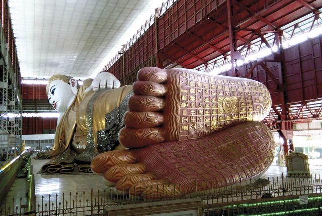 佛教传入缅甸已有2500多年的历史,缅甸人也以信奉佛教为主。始建于公元前588年,被称为东方艺术块宝的缅甸仰光大金塔,供奉着四位佛陀的遗物,分别是拘留孙佛的杖、正等觉金寂佛的净水器、迦叶佛的袍、佛祖释迦牟尼的八根头发。大金塔除了是缅甸最神圣的宝塔,也是驰名世界的佛教圣地。它从初建时的8米高经历代多次修缮改建至现在的112米。塔顶有个镶嵌了成千上万颗珠宝钻石的金属宝扇,而塔身经过多次贴金,黄金重量已达约7000公斤,绝对称得上“金”碧