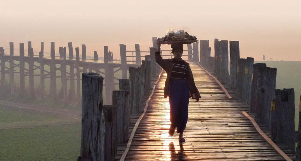从大部分建筑艺术中可窥见缅甸人民有多热爱柚木。重建于20世纪30年代的曼德勒皇宫,是座柚木结构建筑,宫内有约一百多座大小殿宇,是规模宏大的建筑代表作,红、金、白相间,远观很是耀眼。再来是游览建于1851年的百年乌本大桥(Ubein Bridge)。这座位于曼德勒南方约11公里的大桥,从桥墩、桥梁到桥板也都是用结实耐腐蚀的柚木搭建,是世界上最长的柚木桥。每日桥上熙来攘往的人流不断,微风拂面的瞬间,有了沧桑百年物是人非之感。它以Z字形横跨东塔曼湖(Taungthman Lake),据知这样的设计有助减缓雨季时大水对桥的强大冲击。