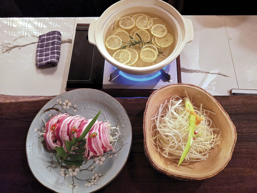 黑猪肉涮涮锅(Kurobuta Shabu Shabu,每人$38,最少2人)是另一受欢迎主打。摆上桌时只见清澈汤里飘着片片柠檬,只为给予汤头清香和之后的涮烫不油腻。食用前把拧檬片捞起,将切成薄片的黑猪肉快速涮煮,不止保留了原味,感觉清甜中口感不俗。再蘸点店家提供的三种由厨房自制的蘸料,分别是ponzu、芝麻和辣酱,口感极佳,层次感丰富。吃着涮涮锅时,再配上精酿日式清酒,体验一下日本人的惬意生活!