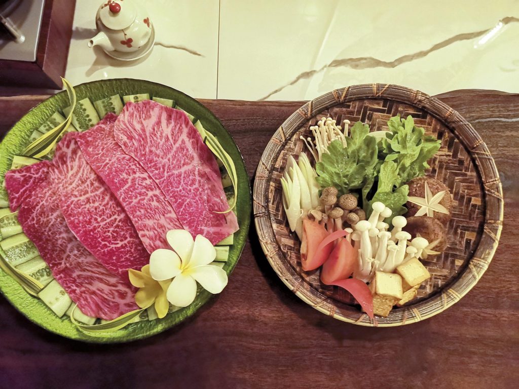 主打的日山和牛寿喜烧(Hiyama Wagyu Sukiyaki,每人$68,最少2人),选用的是高端顶级和牛,超薄肉片色泽粉嫩和带有漂亮均匀的油脂纹理。品尝日式寿喜烧时一定要蘸食生鸡蛋,想一想,那丰腴脂香的牛肉裹着蛋液,再配上店家特制酱汁,入口就是鲜美滑嫩,脂香四溢,美妙无比。寿喜烧也可加点牛肉($50)、面条($8)和蔬菜($10),做成涮涮锅,收费相同。