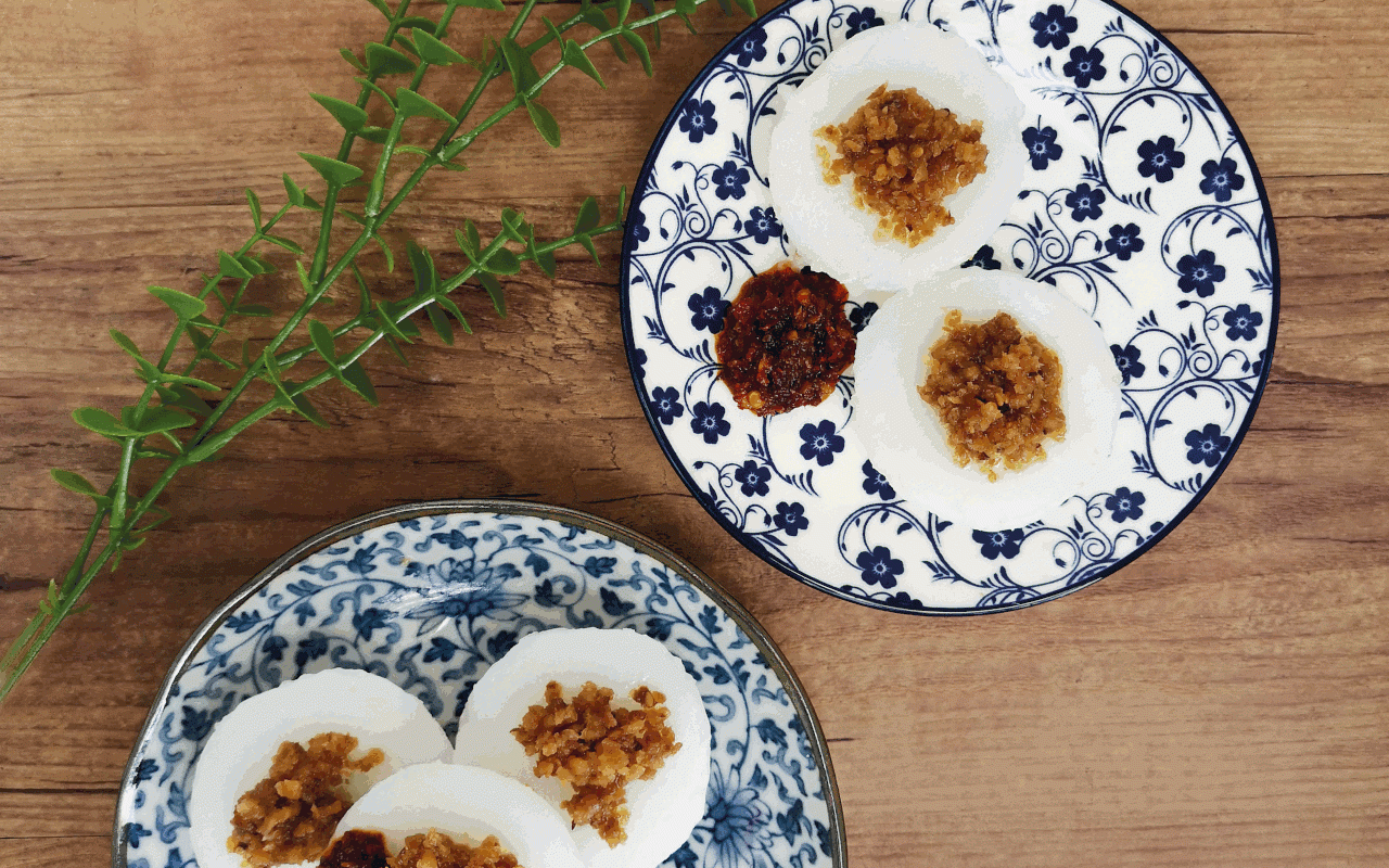 水粿 October 19, 2020October 27, 2020 用料粘米粉2碗粟粉1汤匙清水1碗半 菜脯料食油适量蒜茸10克小红葱2个,切碎菜脯碎1碗麻油少许 菜脯作法1 炒锅内倒入适量食油,放入蒜茸和红葱茸稍炒至香。2 放入菜脯碎和麻油,稍拌后以小火焖煮约半小时。 水粿作法1 把粘米粉、粟粉和清水搅拌均匀成米浆。2 将搅拌均匀的米浆倒入事先抹上一层油的水粿模里。3 取蒸锅倒入适量水,待水沸腾时放入粿模蒸约15至20分钟至熟。4 食用时扣出水粿,然后撒上菜脯即可。 Similar Posts 萝卜鲜橙牛油蛋糕 黄豆奶油泡芙