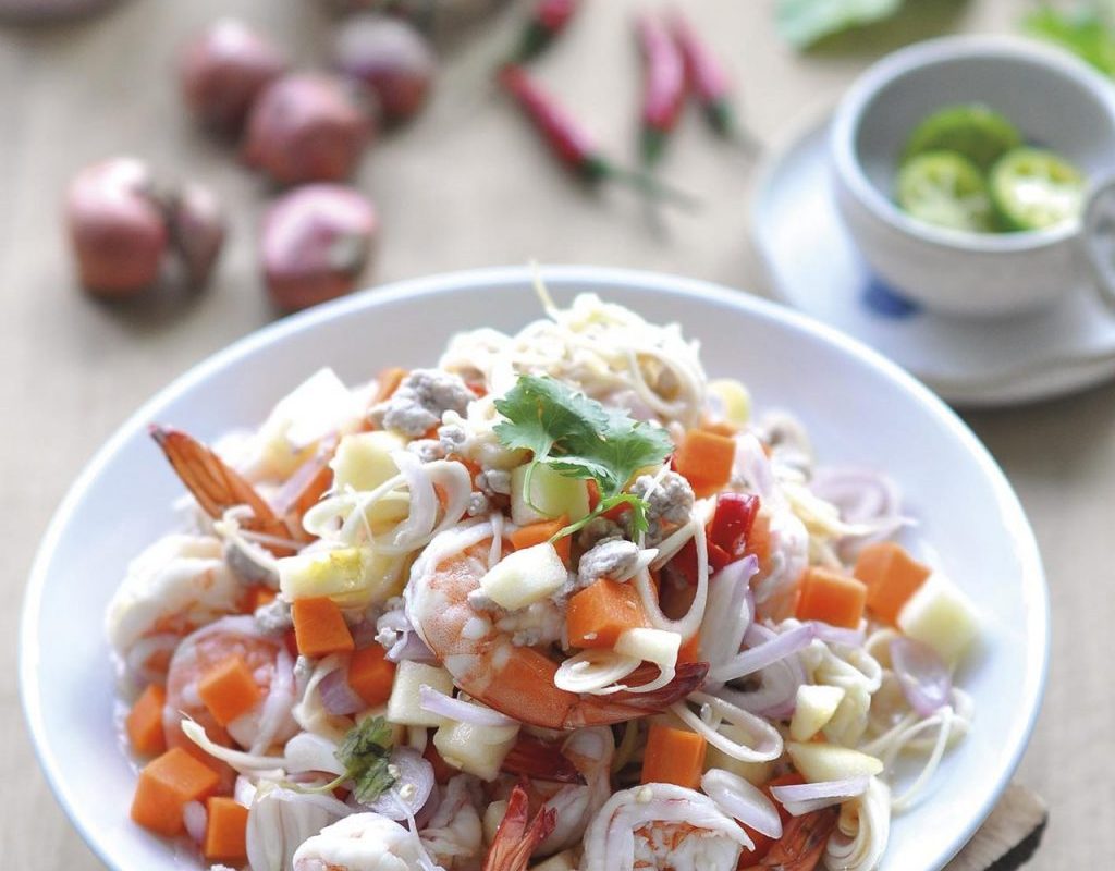3 在大碗中依序放入香茅片、红葱头片、苹果丁、红萝卜丁及指天椒粒,搅拌均匀。
