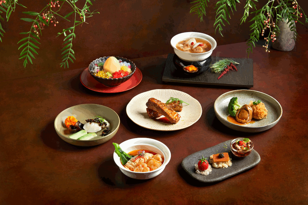 新厨新菜品,由Edden率领团队精选推出的海天楼招牌套餐(每人$228,最少2人),就有特色点心拼盘:鱼子酱脆皮乳猪件,芥末汁冻老虎螺,冰霜话梅小番茄、山竹点心以及柚子鸡;香清甜润、风味融合度佳的铁皮石斛花胶干贝螺头鸡汤;鲜嫩多汁、咸香入味的远年老菜脯蒸鲈鱼柳;蚝皇鲍汁扣四头南非鲍鱼及百花海参,鲍鱼入口鲜嫩弹牙、炸海参外酥内糯;撒上青柠丝的滋味青柠西班牙猪肋排,肉质紧实鲜嫩不腻口的同时带清爽;自制酸番茄汤底的香煎龙虾带子番茄酸汤面线,给予鲜、酸、爽的复合口感体验;设计灵感源于熔岩蛋糕的花开富贵雪燕杨枝甘露,是把装了液体芒果泥的白色巧克力蛋敲破后,与碗底铺着的燕窝、柚子、西瓜粒、椰纤果粒等融合,入口柔滑清爽中带微酸,为完美一餐划下句点。