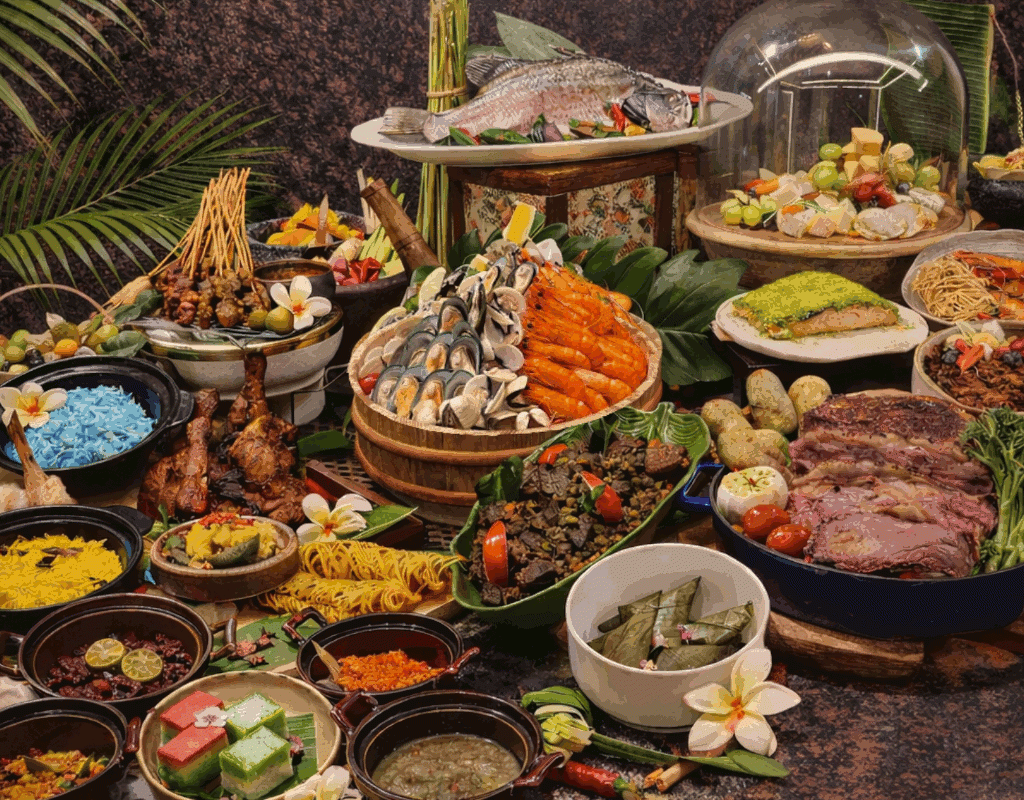一系列轮番登场的珍馐从东南亚菜系到欧美菜系,冰镇海鲜到自助沙律,让食客一站尽享环球美食。不论是粤式烧味的烧鸭烧肉,本地美食如叻沙、虾面、泡饭、海南鸡飯等;西式经典如冷切与芝士拼盘、普罗旺斯烤鸡、意式炖牛肉;亚洲风味的酱油清汤鲈鱼片、蒜姜爆炒牛肉片等,以及可搭配黄姜饭或蝶豆花米饭,风味浓郁的印尼料理如仁当鸡、仁当牛肉、巴东咖喱鸡等。每一种料理各有其独特韵味的同时也展现出新加坡层次丰富的美食文化。